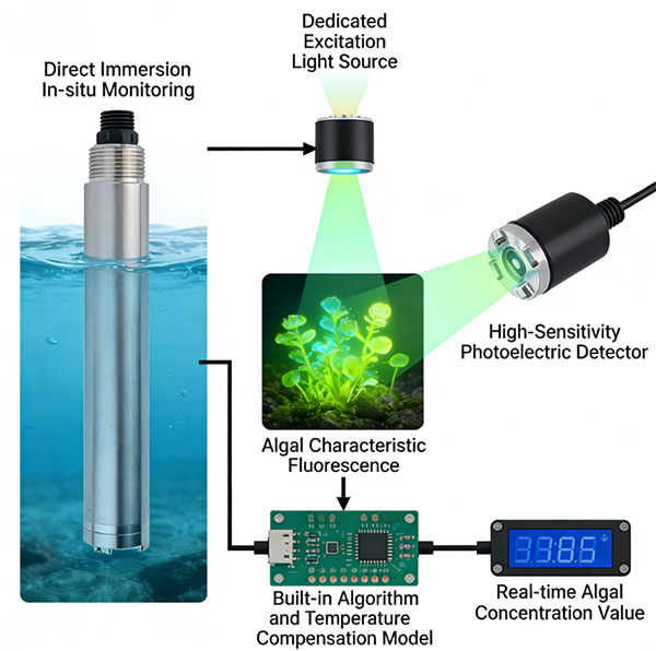Bu sistem, tüm süreç boyunca kimyasal reaktiflere veya su numunesi ön işlemine ihtiyaç duymadan, suya daldırılarak doğrudan yerinde izleme olanağı sağlar. Mavi-yeşil alglerin benzersiz fikocyanin ve klorofil floresans özelliklerine dayanan ekipman, özel bir uyarıcı ışık kaynağı ve yüksek hassasiyetli bir fotodedektör ile donatılmıştır. Alg hücrelerini uyararak karakteristik floresans oluşturduktan sonra, yerleşik bir algoritma ve sıcaklık dengeleme modeli aracılığıyla floresans sinyalini hızla alg konsantrasyon değerlerine dönüştürür. Hızlı tepki ve yüksek algılama doğruluğu ile su kütlelerinin gerçek zamanlı alg durumunu yansıtır ve geleneksel algılamanın gecikme sorununu tamamen çözer.