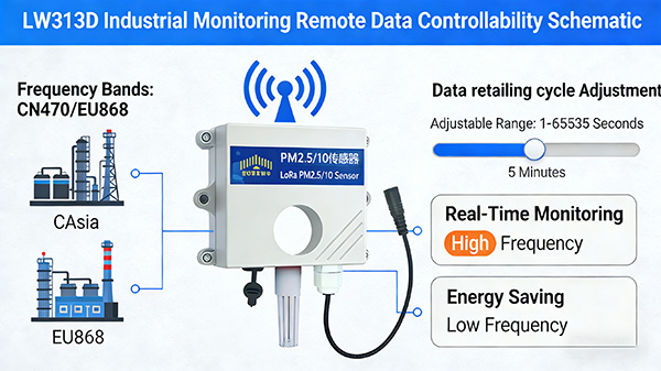 Endüstriyel izlemenin temel gereksinimlerinden biri uzaktan veri kontrol edilebilirliğidir. LW313D, LoRaWAN kablosuz iletim protokolünü destekler ve CN470 ve EU868 gibi birden fazla frekans bandını kapsayarak farklı bölgelerdeki endüstriyel tesisler için uygun hale gelir. Varsayılan veri raporlama döngüsü 5 dakikadır ve bu süre 1 ile 65535 saniye arasında esnek bir şekilde ayarlanabilir. Bu, yalnızca gerçek zamanlı izleme ihtiyaçlarını karşılamakla kalmaz, aynı zamanda enerji tüketiminden tasarruf etmek için raporlama sıklığını tesisin gereksinimlerine göre ayarlamaya da olanak tanır.