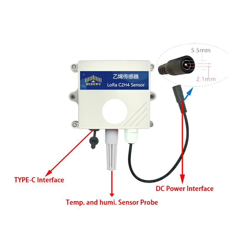 Bu LoRaWAN etilen sensörü, LoRa kablosuz teknolojisine dayalı bir gaz izleme cihazıdır. İşlevi, ortamdaki etilen konsantrasyonunu, sıcaklığı ve nemi gerçek zamanlı olarak ölçmektir. Çekirdek konfigürasyonu, entegre yüksek performanslı bir etilen sensörü ve bir sıcaklık ve nem sensöründen oluşur.