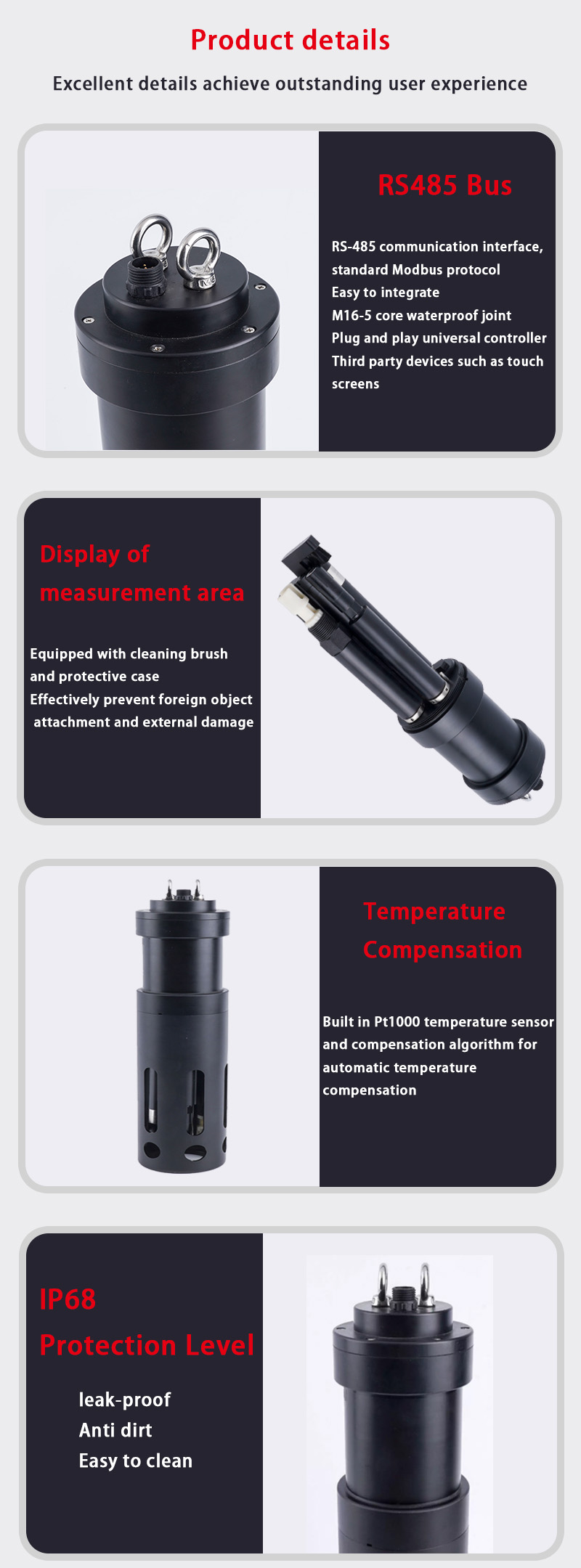 Endüstriyel sınıf IP68 su geçirmezlik tasarımı ve korozyona dayanıklı malzemeleriyle, zorlu su ortamlarında (örneğin, atık su depoları, kıyı su ürünleri yetiştiriciliği) minimum bakım gereksinimiyle sürekli olarak çalışır.
