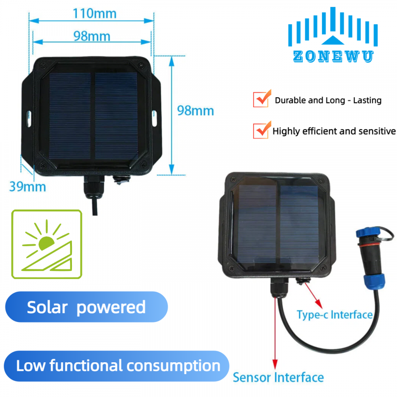 ZONEWU LoRa güneş enerjili toprak EC/PH/sıcaklık ve nem sensörü, güneş enerjisi beslemesi ve uzaktan iletişim teknolojisini entegre eden bir çevre izleme cihazıdır. Temel işlevi, gerçek zamanlı toprak EC/PH/sıcaklık ve nem verilerini toplamaktır.